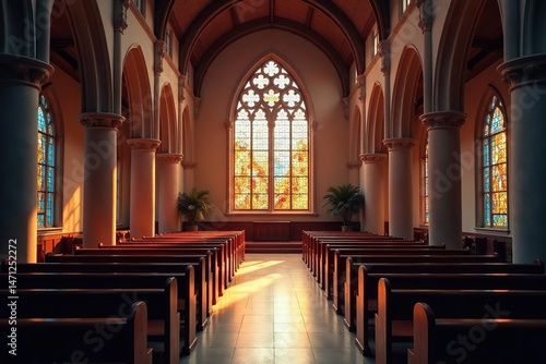 Fototapeta premium Serene church interior, stained glass illuminating quiet prayer space ,...