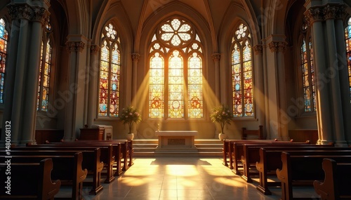 © Chanchai, Obraz premium Serene church interior, sunlight streaming through stained-glass windows, highlighting the altar , building interior, light
