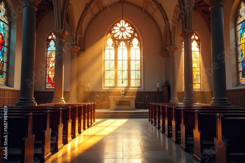 Fototapeta premium Serene church interior, sunlight streaming through stained-glass windows...