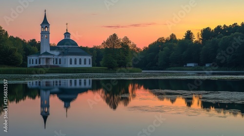 © Pixcellence, Naklejka premium Serene Church Reflection at Sunrise on a Calm Lake