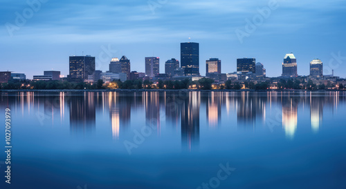 Fototapeta premium Serene City Skyline at Twilight Reflection