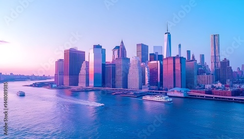 Fototapeta premium Serene cityscape at dawn, showcasing a cluster of skyscrapers along a tranquil waterfront with passing vessels