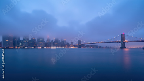 © Napat, Fototapeta premium Serene cityscape at dusk, featuring bridge and skyline shrouded in mist, creating tranquil atmosphere