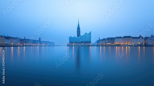 Naklejka premium Serene Cityscape at Dusk with Calm Water Reflection in Germany