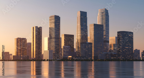 Fototapeta premium Serene cityscape at golden hour with towering modern skyscrapers reflecting...