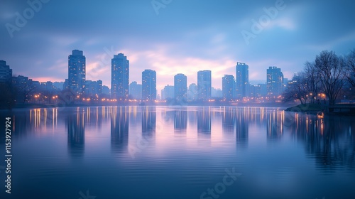 Naklejka premium Serene Cityscape Reflection at Dusk with Soft Blue Sky