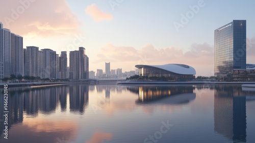 © Artajar, Obraz premium Serene cityscape reflection on calm waters during twilight paints a modern urban skyline against soft pastel sky highlighting architecture