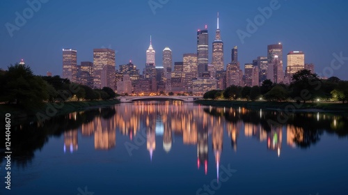 © Kitta Studio, Fototapeta premium Serene Cityscape Reflections at Dusk Over Water in Urban Environment
