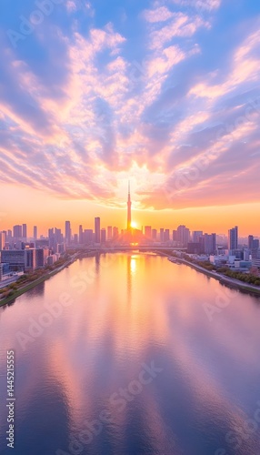 Fototapeta premium Serene cityscape sunrise reflected in calm waters, pastel sky