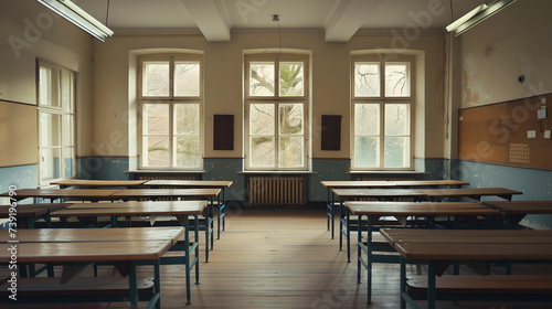 Naklejka premium Serene classroom without students, emptiness and silence prevail. clean...
