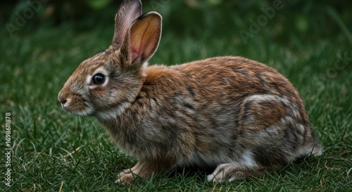 © srie, Fototapeta premium Serene Close-Up of a Wild Brown Rabbit Resting Peacefully on Lush Green Grass