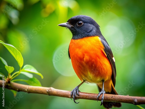 © Supittra, Fototapeta premium Serene Close-Up of an Orange and Black Bird Perched Elegantly on a Branch Surrounded by Lush Greenery in a Tranquil Natural Setting Capturing the Essence of Wildlife Serenity