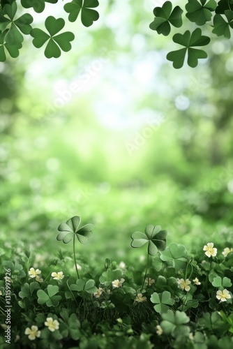 Fototapeta premium Serene Clover Meadow with Soft Bokeh Background and Gentle Sunlight Creating a Peaceful and Lucky Atmosphere for Spring Celebration