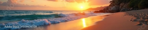 © Nannapin, Naklejka premium Serene coastal beach scene at sunset, with soft golden light illuminating the tranquil ocean waves and sandy shore Perfect for travel, vacation, or nature themes , seascape, tropical