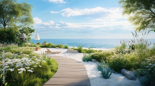 © Shahida, Naklejka premium Serene Coastal Beach Walkway with Lush Greenery and Comfortable Loungers