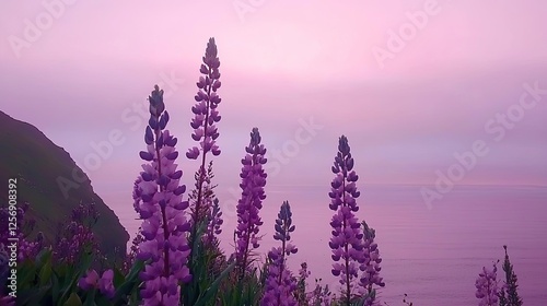 Naklejka premium Serene coastal landscape featuring vibrant purple flowers against a pastel...