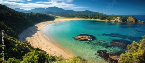 Fototapeta premium Serene coastal landscape showcasing pristine beaches and lush natural...