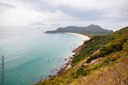 © Bossa Art, Fototapeta premium Serene Coastal Landscape with a Curved Beach in a Cloudy Day
