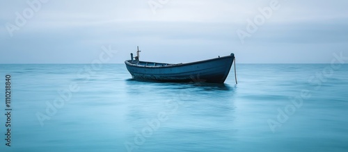 Fototapeta premium Serene coastal landscape with a lonely boat floating on the tranquil waters...