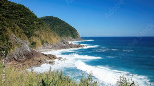 © Sampao, Fototapeta premium Serene Coastal Landscape with Blue Ocean Waves