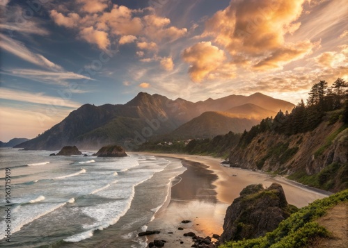 Naklejka premium Serene Coastal Landscape with Majestic Mountains Under Soft Lighting for...