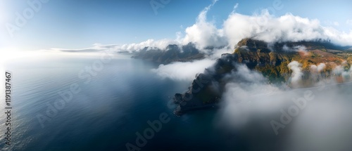 © Arthur Constantine, Fototapeta premium Serene Coastal Landscape with Misty Cliffs and Tranquil Ocean View