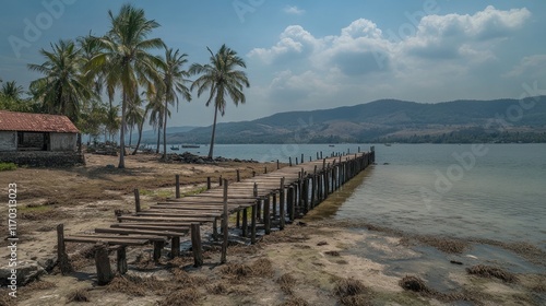 © yusufadi, Obraz premium Serene Coastal Landscape: Wooden Pier Extending into Tranquil Waters