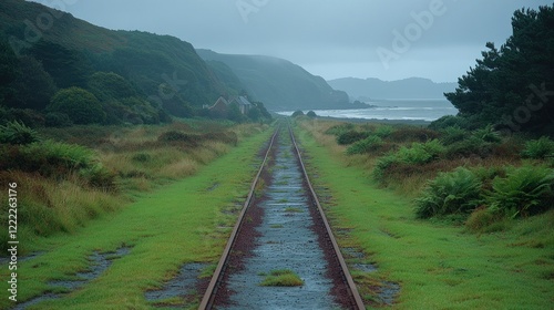 Fototapeta premium Serene Coastal Railway: An Overgrown Railway Track Leading to the Sea