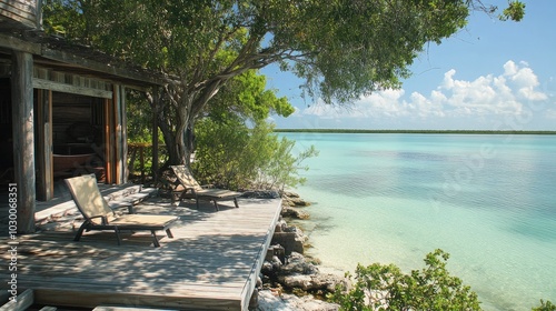 Naklejka premium Serene Coastal Retreat with Lounge Chairs by Water
