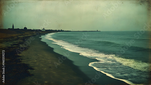 © abid, Fototapeta premium Serene coastal scene a tranquil beach stretches towards a distant town under a muted sky, gentle waves lapping the shore