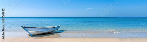 © Chanoknan, Naklejka premium Serene coastal scene with a boat resting on a pristine sandy beach against a calm, clear blue sea under a bright, cloudless sky.