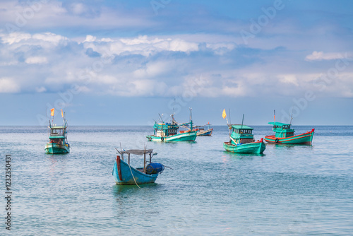 Fototapeta premium serene coastal scene with several traditional fishing boats floating on calm,...