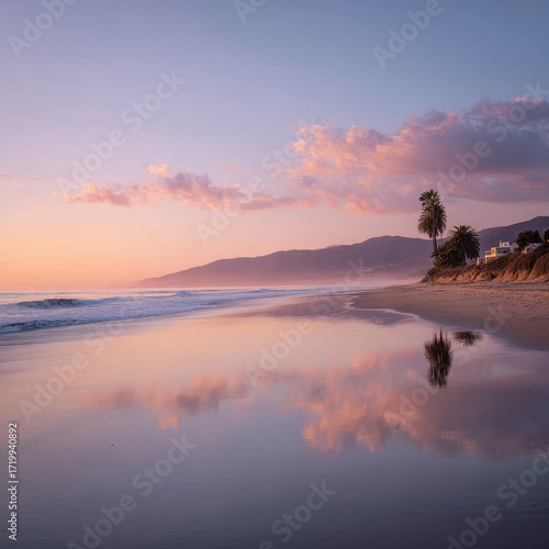 Obraz premium Serene Coastal Sunset - Reflective Beach Scene with Pastel Sky and Calm Waters.