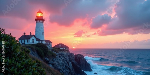 Naklejka premium Serene coastal sunset scene featuring a majestic lighthouse standing tall on...