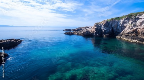 Naklejka premium Serene Coastal View of Cliffside and Crystal Clear Waters in Bright Natural...