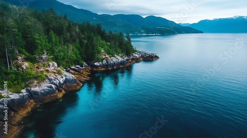 Naklejka premium Serene coastal view with lush greenery and calm waters reflecting the mountains in the distance : Generative AI