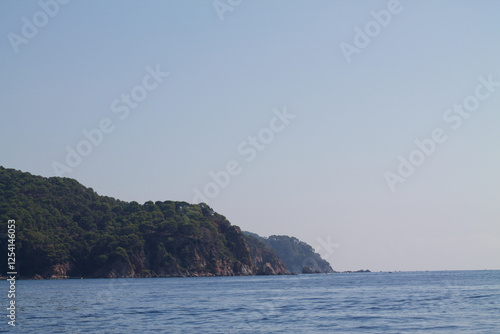 © Jeandre, Fototapeta premium Serene Coastal View with Rocky Shoreline and Lush Hills