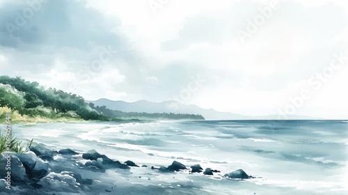 © rawdesign, Obraz premium Serene Coastal Watercolor: Tranquil Beachscape with Mountains and Ocean