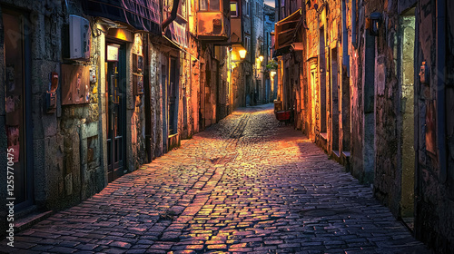 Fototapeta premium Serene cobblestone alleyway illuminated by street lamps at dusk, evoking a...