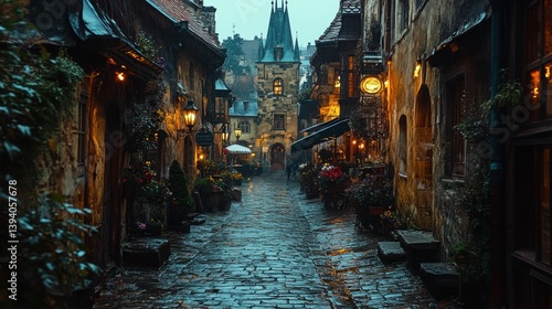 Fototapeta premium Serene cobblestone street in a quaint village, illuminated by warm lights,...