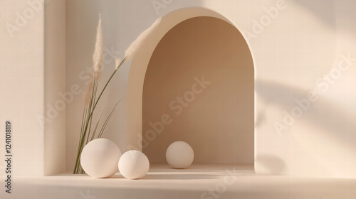 Fototapeta premium serene composition of soft white spheres and delicate plants in minimalist...
