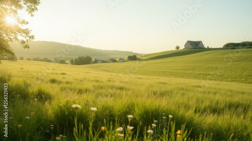 © Kitta Studio, Fototapeta premium Serene Country Landscape with Rolling Hills and a Cozy House at Sunset