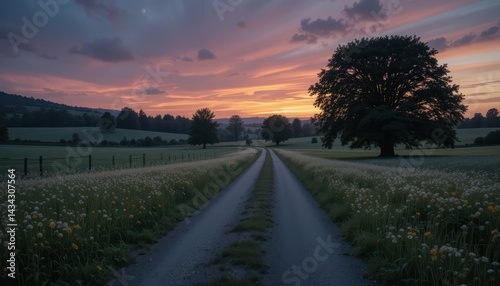 © Kitta Studio, Obraz premium Serene Country Road at Sunset with Vibrant Sky and Trees