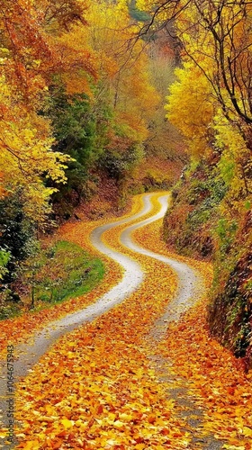 © Kitta Studio, Obraz premium Serene Country Road Covered in Autumn Leaves