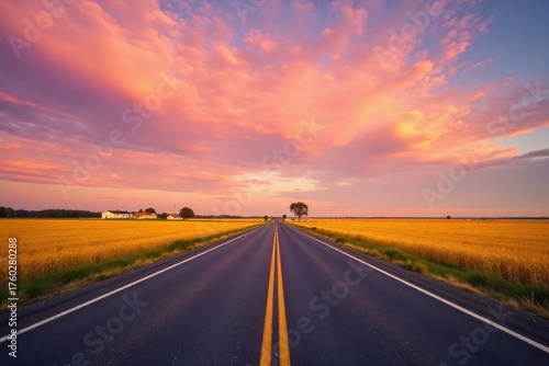 Naklejka premium Serene country road disappearing into the distant horizon, vast open land,...