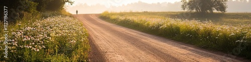 © Сергей Захаров, Naklejka premium Serene country road in misty golden sunrise
