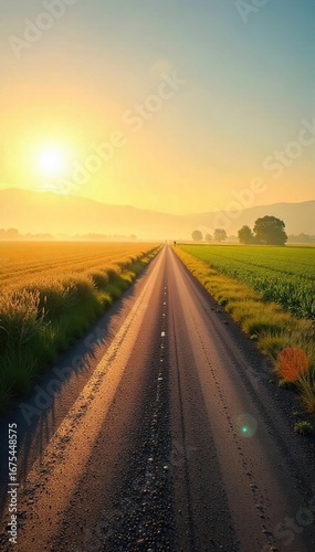 Naklejka premium Serene country road stretching towards a hazy horizon, sun-drenched fields...