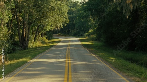 Fototapeta premium Serene Country Road Surrounded by Lush Green Trees in Natural Landscape