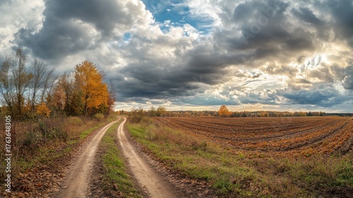 Naklejka premium Serene Country Road Through Autumn Landscape with Dramatic Skies