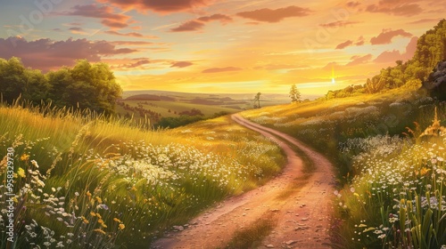 Fototapeta premium serene country road winding through rolling hills, with a golden sunset casting a warm glow over the landscape